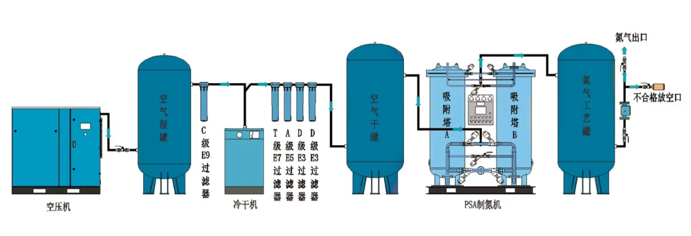 制氮機被廣泛應用于各行各業(yè),它的工作原理是怎么進行的?首先被空壓機壓縮好的混合氣體伴隨著顆粒物、水、油物進入到壓縮管道,緊接著空氣會經(jīng)過第一級管道,過濾器直徑大于五微米的粉塵顆粒將被吸附在過濾器中,有部分的液態(tài)水會通過自動排水口排出。接下來伴有水汽的濕空氣會經(jīng)過冷凍式干燥機進行氣液分離,此時的壓縮空氣已經(jīng)非常干燥,但是空氣中還有更小的顆粒物和油霧,所以接下來還會再進入三級不同過濾等級的過濾器進行經(jīng)過濾,此時達到了無油無水狀態(tài)的空氣將進入緩沖罐。這使得空氣中含有百分之七十八的氮氣,百分之二十一的氧氣和百分之一的其他氣體。接下來,空氣將在兩個裝有分子篩的制氮機a b塔主機中進行分離。當a塔吸附氮氣的時候,b塔將托付其他混合氣體并排出。當b塔吸附氮氣的時候,a塔將托付其他氣體并排出,分離好的氮氣會經(jīng)過管道進入到氮氣緩沖罐內(nèi)。最終氮氣會在最后一支過濾器處理后,經(jīng)過流量計進入到氮氣罐并投入使用。